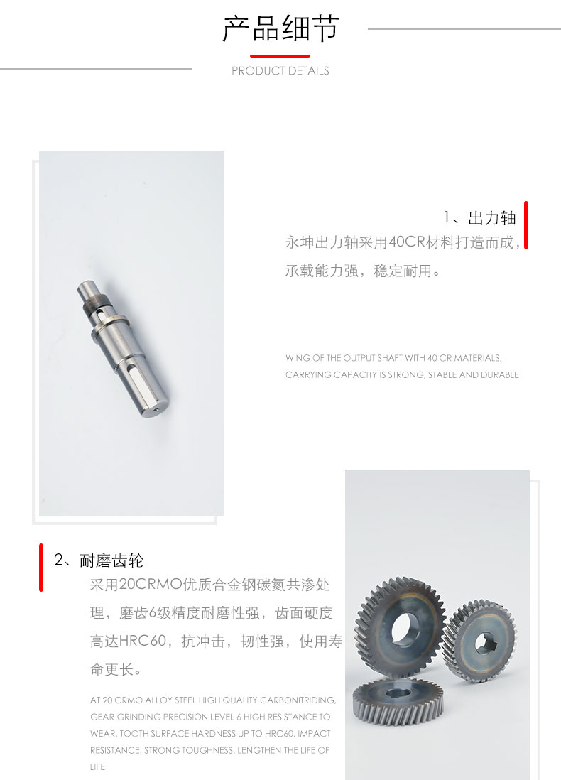 齒輪采用高強度低碳合金鋼經滲碳淬火而成,齒面硬度達HRC58-62,齒輪均采用數控磨齒工藝,精度高,接觸性好。齒輪重合度高出同行30%;