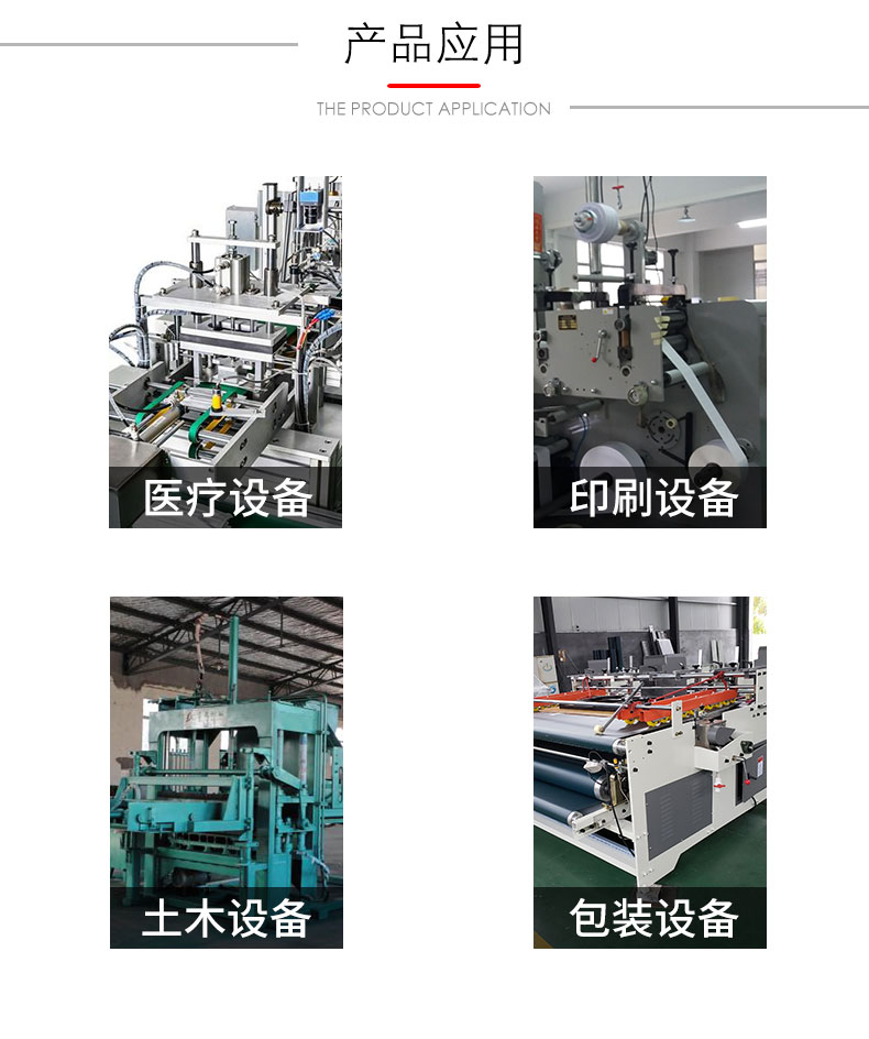 易于拆檢,易于安裝.。 產品廣泛應用于一般場所和無特殊要求的精密機械上,典型應用于電子設備、醫療設備、印刷機械、包裝機械、紙箱機械、食品機械、拉鏈機械、涂裝機械、五金機械、機械手、注塑機、木工機械、化妝品機械、紡織機械、灌裝機械及化工機械等。