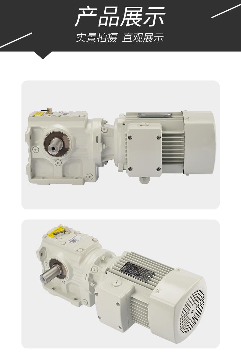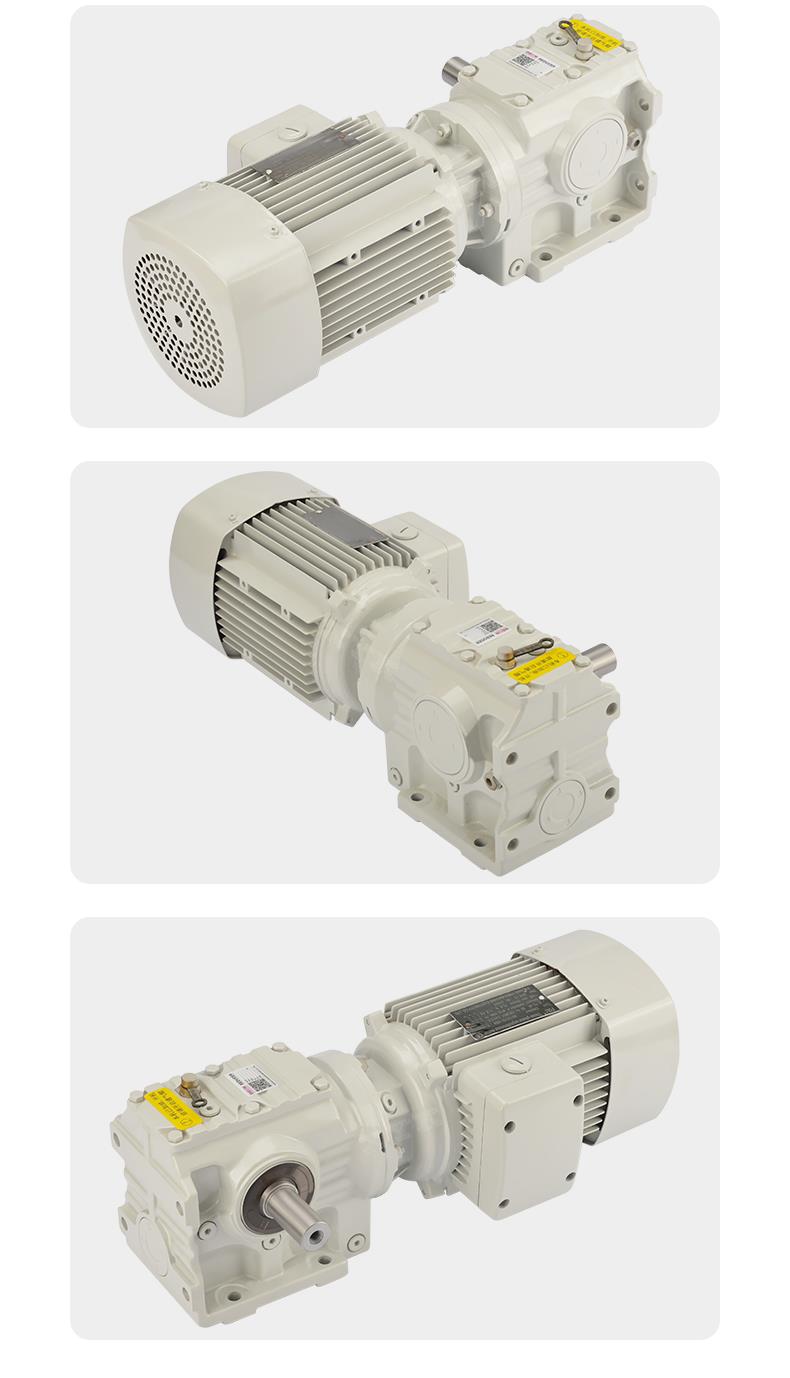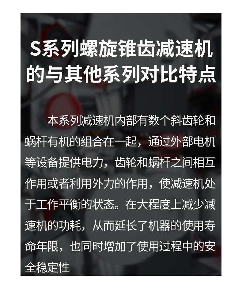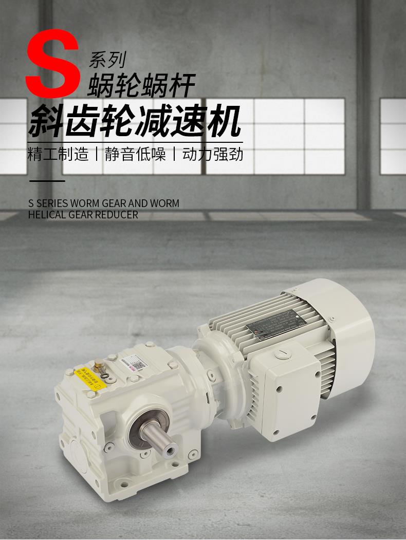 1、S系列斜齒輪蝸桿減速機具有很高的科技含量,有斜齒輪與蝸輪蝸桿結合一 體傳動,提高該機力矩與效率。該系列產品規格齊全,轉速范圍廣,通用性好,適應各種安裝方式,性能安全可靠壽命長,實施了國際標準要求。