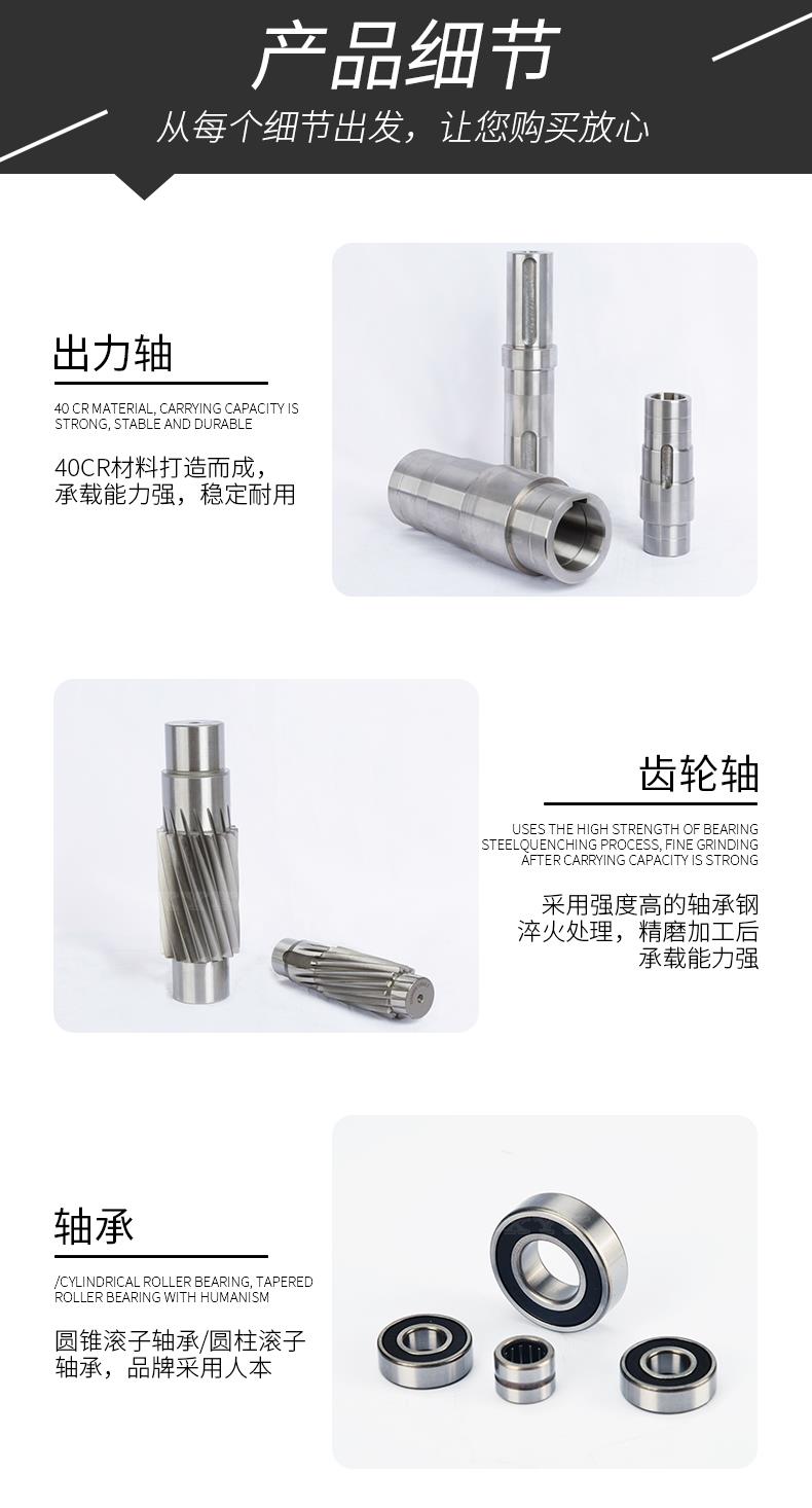 5、該減速電機關鍵零部件采用了高耐磨材料,并經過特種熱處理,具有加工精度高,傳 動平穩、體積小承載能力大、壽命長等特點。